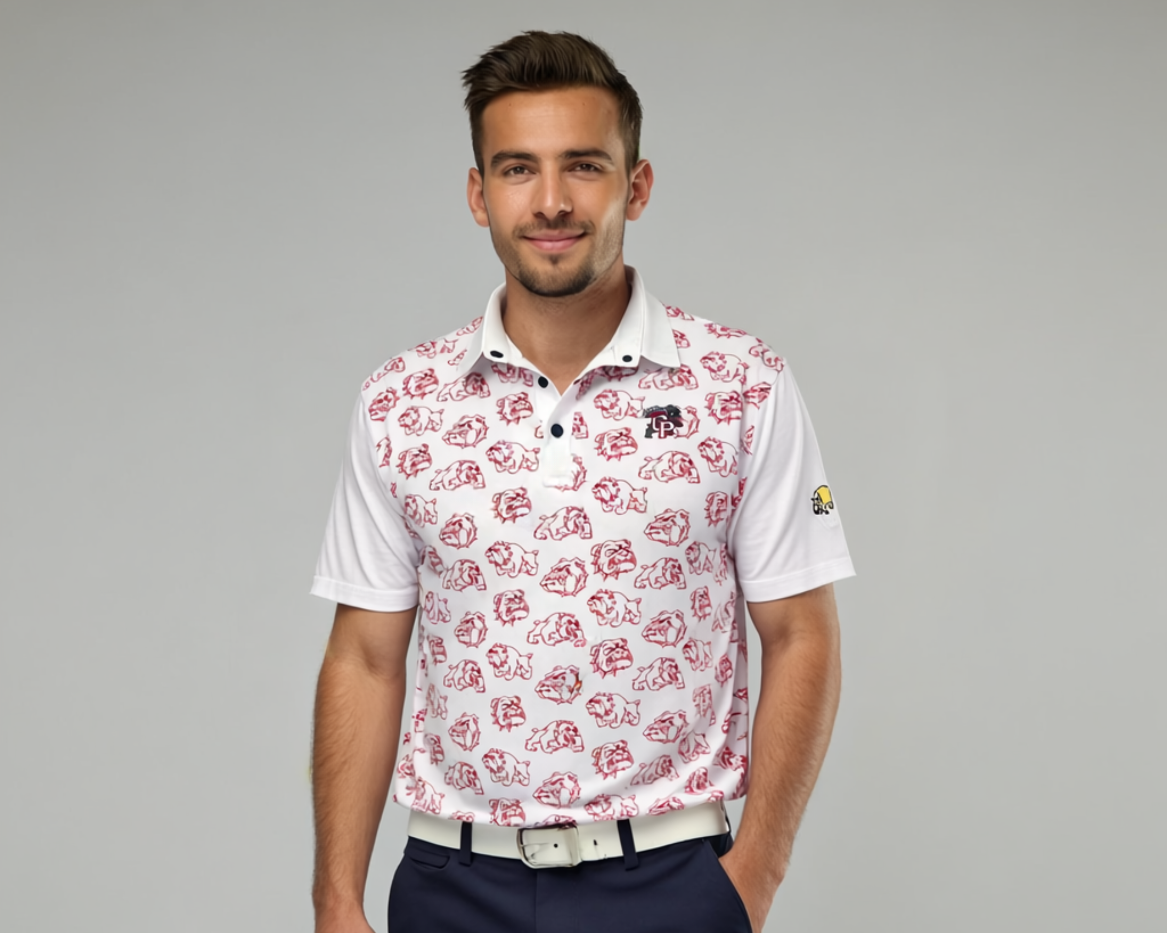 Crown Point Bulldog men's shirt features bulldog designs on the shirts, embroidered CP bulldog logo on the chest and Chippopotamus logo on the sleeve!